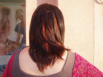 Le hice mechas en bloques a 30 vol, y luego al quitarlas puse un cobren intenso ( 7.44 de Indola) en las mechas. Lo deje 20 minutos y los ultimos 5 m lo emulsione en todo el pelo.