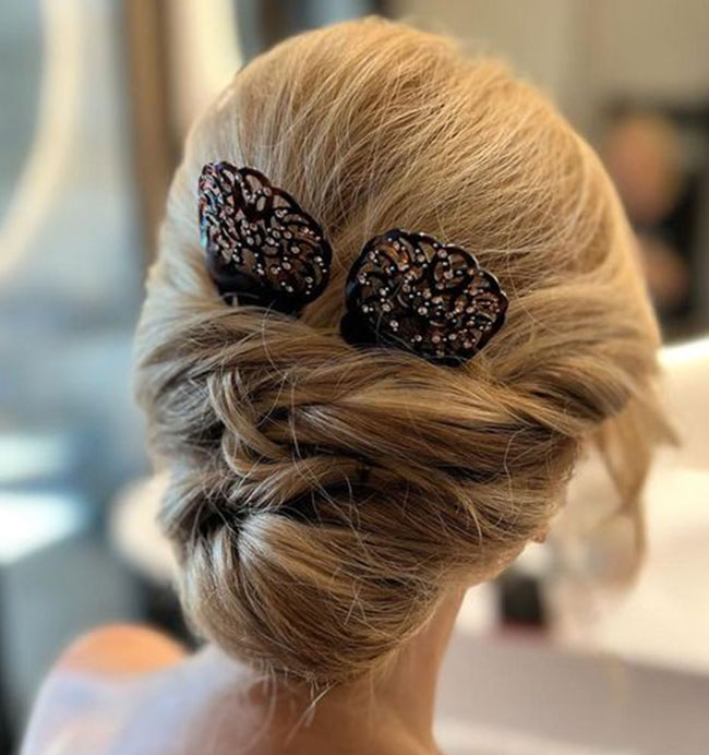 - Como no tiene el cabello muy largo, "fuimos cogiendo mechones, retorciéndolos y sujetándolos con horquillas para crear ese efecto de moño bajo con volumen", explica la estilista Encarna Moreno.