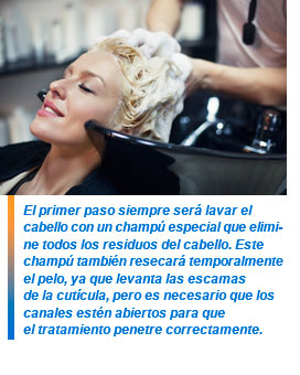 El primer paso siempre será lavar el cabello con un champú especial que elimine todos los residuos del cabello. Este champú también resecará temporalmente el pelo, ya que levanta las escamas de la cutícula, pero es necesario que los canales estén abiertos para que el tratamiento penetre correctamente. Tras el lavado debe retirarse el exceso de humedad del cabello pero sin llegar a secarlo del todo, ya sea a mano con una toalla o con un secador de iones positivos a baja potencia, que ayudarán a abrir más las escamas.