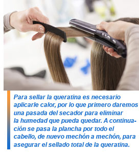 Para sellar la queratina es necesario aplicarle calor, por lo que primero daremos una pasada del secador para eliminar la humedad que pueda quedar. Si el secador es de iones negativos mucho mejor, puesto que este tipo de iones son lo que cierran las escamas de la cutícula. A continuación se pasa la plancha por todo el cabello, de nuevo mechón a mechón, para asegurar el sellado total de la queratina.