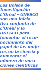 Las Bolsas de Investigación L'Oréal - UNESCO son una iniciativa conjunta de L'Oréal y la UNESCO para fomentar el reconocimiento del papel de las mujeres en la ciencia y aumentar el número de vocaciones científicas. Acreditado por un acuerdo firmado en 2006 entre el ministerio de Educación y Ciencia y L'Oréal España, el programa se inició ese año con tres Bolsas y ha aumentado hasta cinco en esta quinta edición, lo que reafirma el apoyo de L'Oréal y la UNESCO a todas las mujeres científicas de nuestro país.