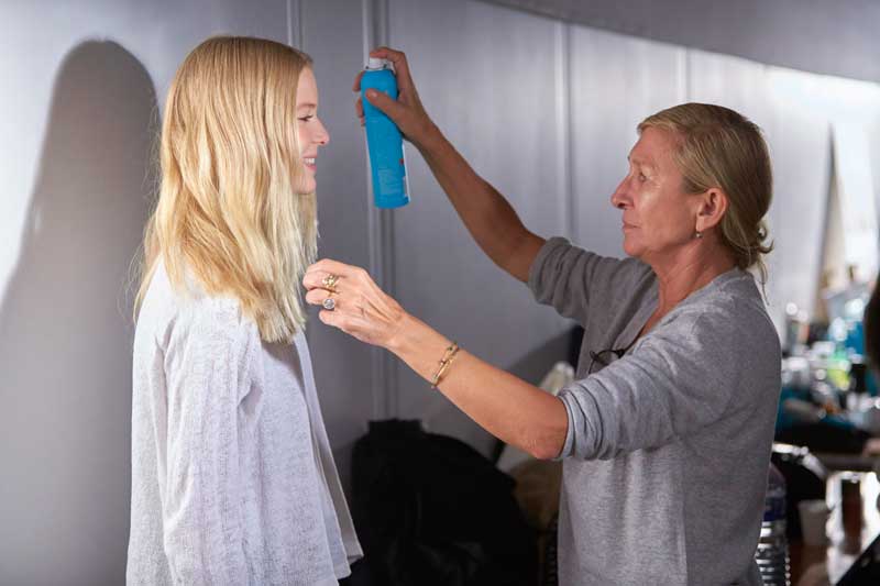 - Una vez que está hecha la raya en medio, se usa una plancha de pelo y el Fijador Luminoso Medio Moroccanoil para una fijación con movimiento. Se riza ligeramente un par de cabellos en el medio para dar un aspecto natural.