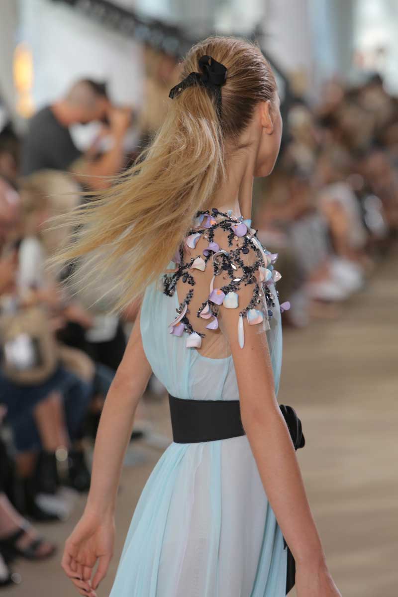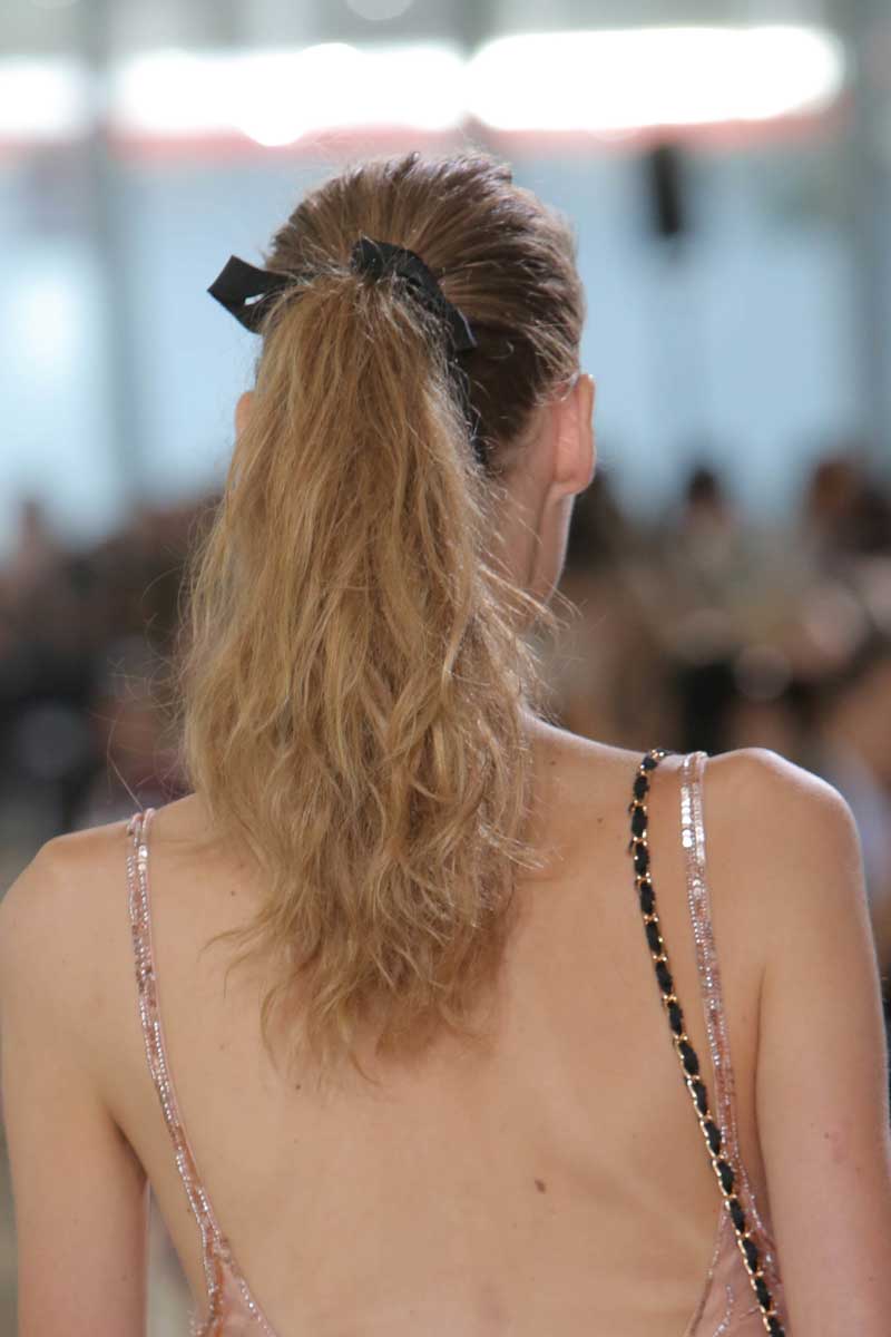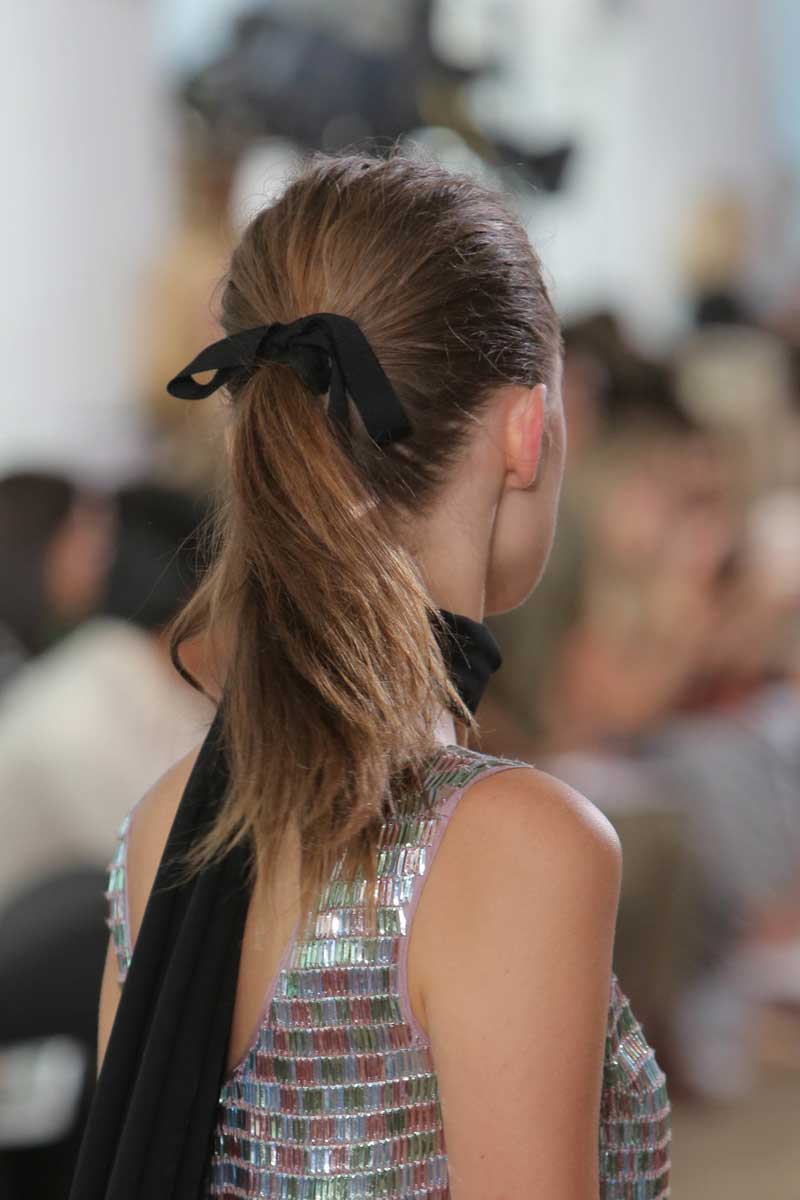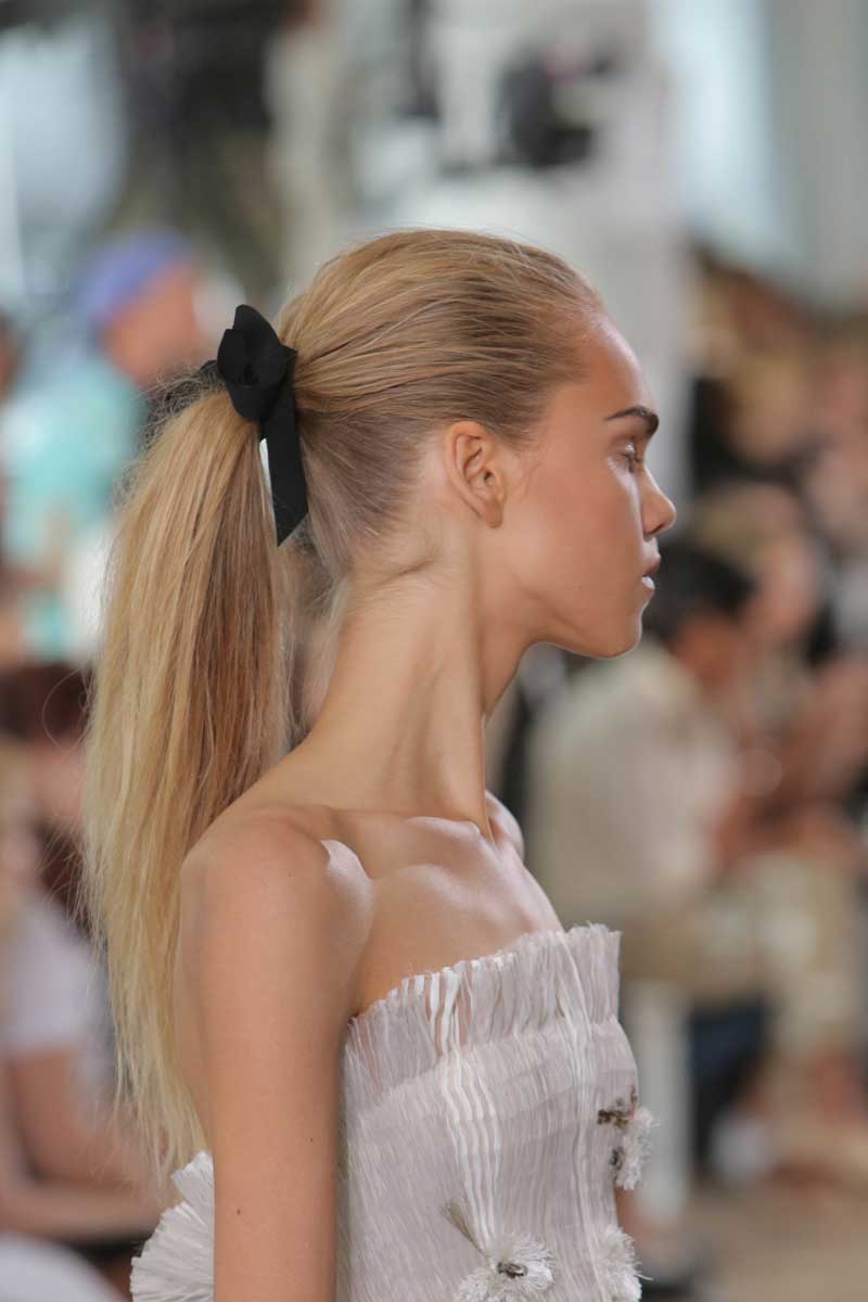 "Para este peinado no se requiere cepillado, esta cola de caballo alta y femenina tiene la textura punky perfecta que contrasta con la madurez y seriedad de los diseños de la colección primavera / verano de Monique Lhuiller."