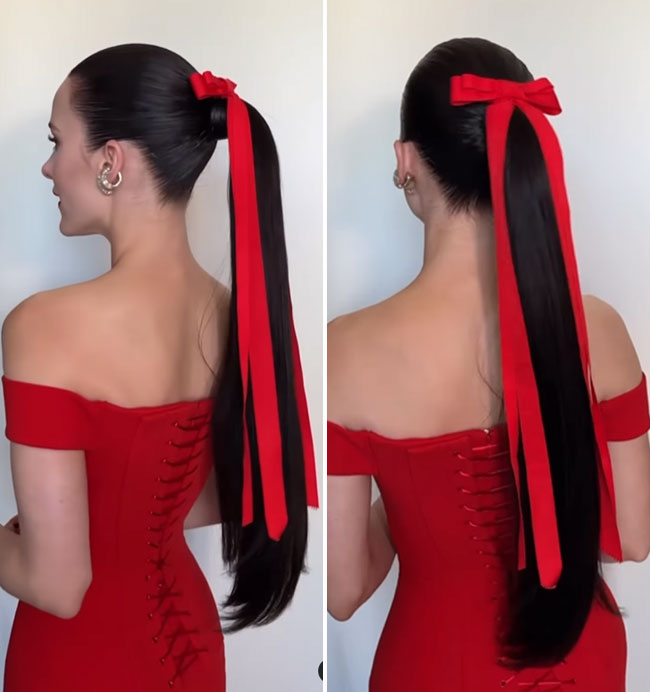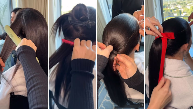 Toques finales: para asegurar una apariencia cohesiva y elegante, pasé por la cola de caballo una vez más con la plancha Edrée The Méline de 1,25". A continuación, utilicé la pomada SexyHair Style Polished Up para colocar los cabellos sueltos. Para fijar la cola de caballo, lo hice con SexyHair Big Spray & Play Harder Hairspray para agregar una fijación duradera. Terminé el look con un lazo rojo para acentuar el color del vestido de Rachel.