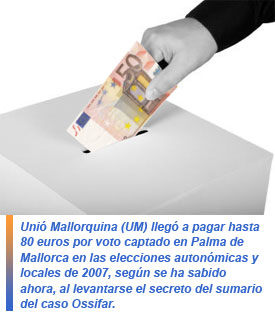 Hasta 80 euros por voto a favor del partido Unió Mallorquina se llegó a ofrecer en distintas peluquerías, panaderías, institutos o en centros de la Tercera Edad de Palma de Mallorca. Esto se desprende del sumario del 'caso Ossifar', que investiga la supuesta captación de votos por parte de UM y la posterior contratación irregular de distintas personas, y cuyo secreto de sumario ha sido levantado recientemente por el juez Barceló, demostrando las maniobras que realizaron varios miembros de Unió Mallorquina para conseguir votos en las elecciones municipales y autonómicas de 2007.