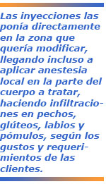 Las inyecciones las ponía directamente en la zona que quería modificar, llegando incluso a aplicar anestesia local en la parte del cuerpo a tratar, haciendo infiltraciones en pechos, glúteos, labios y pómulos, según los gustos y requerimientos de las clientes, a las que aseguraba que el tratamiento era inocuo para la salud y sus resultados altamente efectivos, sin tener que afrontar los altos precios que por tratamientos similares proporcionaban clínicas especializadas en belleza.