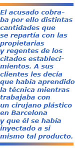El acusado cobraba por ello distintas cantidades que se repartía con las propietarias y regentes de los citados establecimientos. A sus clientes les decía que había aprendido la técnica mientras trabajaba con un cirujano plástico en Barcelona y que él se había inyectado a si mismo tal producto.