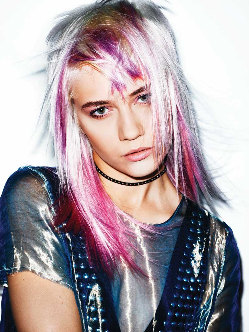 Dirección de acabado: las declaraciones individuales de estilo son el camino a seguir. El estilo Colorama es para los inconformistas. Las formas aleatorias y texturizadas aportan un aspecto DIY post-punk ya que los productos de acabado de OSiS+ y OSiS+ Session Label aportan un acabado duro y listo para llevar.