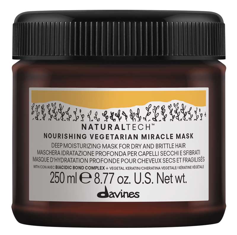 - Nourishing Vegetarian Miracle Mask. Mascarilla de hidratación profunda para cabellos secos y quebradizos. Su rica fórmula brinda nutrientes extras para el pelo, gracias al Biacidic Bond Complex y a la queratina vegetal, dejándolo suave y fácil de peinar. Ideal para un uso tanto en el salón como en el hogar, prolongando los efectos del tratamiento profesional Nourishing. Indicado para cabello grueso o indisciplinado. Aplicar en cabello secado con una toalla sobre medios y puntas. Dejar actuar cinco minutos, peinar y enjuagar.