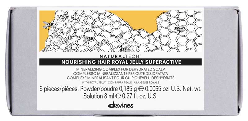 - Nourishing Hair Royal Jelly Superactive. La jalea real contiene incontables vitaminas, aminoácidos, proteínas, oligoelementos, encimas, etc. Davines busca en este elixir de vida la respuesta a la nutrición más sublime del cabello y el cuero cabelludo. Monodosis para aplicar por todo el cuero cabelludo tras la limpieza con un suave masaje.