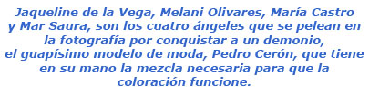 Jaqueline de la Vega, Melani Olivares, María Castro y Mar Saura, son los cuatro ángeles que se pelean en la fotografía por conquistar a un demonio, el guapísimo modelo de moda, Pedro Cerón, que tiene en su mano la mezcla necesaria para que la coloración funcione. Todas ellas caracterizadas de ángeles, junto con el modelo Pedro Cerón que interpreta al diablo, protagonizan esta campaña de comunicación.