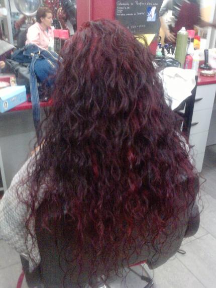 Hola Moni, le he hecho un arrastre, luego he sacado unos mechones anchos a plata y he recoloreado con un granate, no le gusta para nada llevarlo liso, saludos.