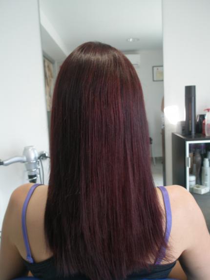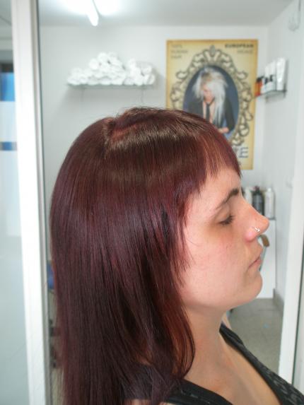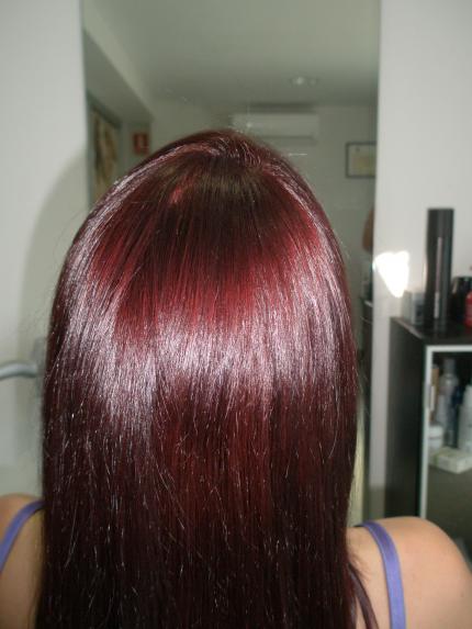 Esta chica llevaba unos 4 cmts de base natural a la altura de un 7 y el resto de tinte...queria ponerse rojiza pero no estaba segura de cual de todos los rojo le gustaba...me ayudo Charol.pro y este fué eñ resultado