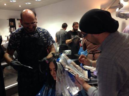 ahi esta la clave amigo IvanAR... Hoja de otoño no quiere eso, ella pide un salon que te lo haga,,, Tu y yo vamos a formacion, estamos toda la tarde con una cabeza o bien como dices nos jodemos un domingo por la mañana (en mi caso) antes de que se levante la familia para ensayar colores y demas... pero eso no es lo que dice.... ella dice entrar en un salon, porque le sale del alma esta tarde o mañana perderla o invertirla en un salon,,, que le realicen ese trabajo... un trabajo de laboratorio, un trabajo especializado.. y no todos esta dispuesto a hacerlo... Mira a tu alrededor, y veras la realidad...""tinte a 5 euros"" ""tinte y mechas desde....""... y poco mas... es cierto que hay salones debe de haberlo.. pero que estamos muy lejos de la realidad que pide hojas maduras .. Espero algun dia coincidir contigo en un evento de color,,, seria todo un placer trabajar contigo....(foto de la semana pasada en madrid con Luciano director de corta cabeza)...