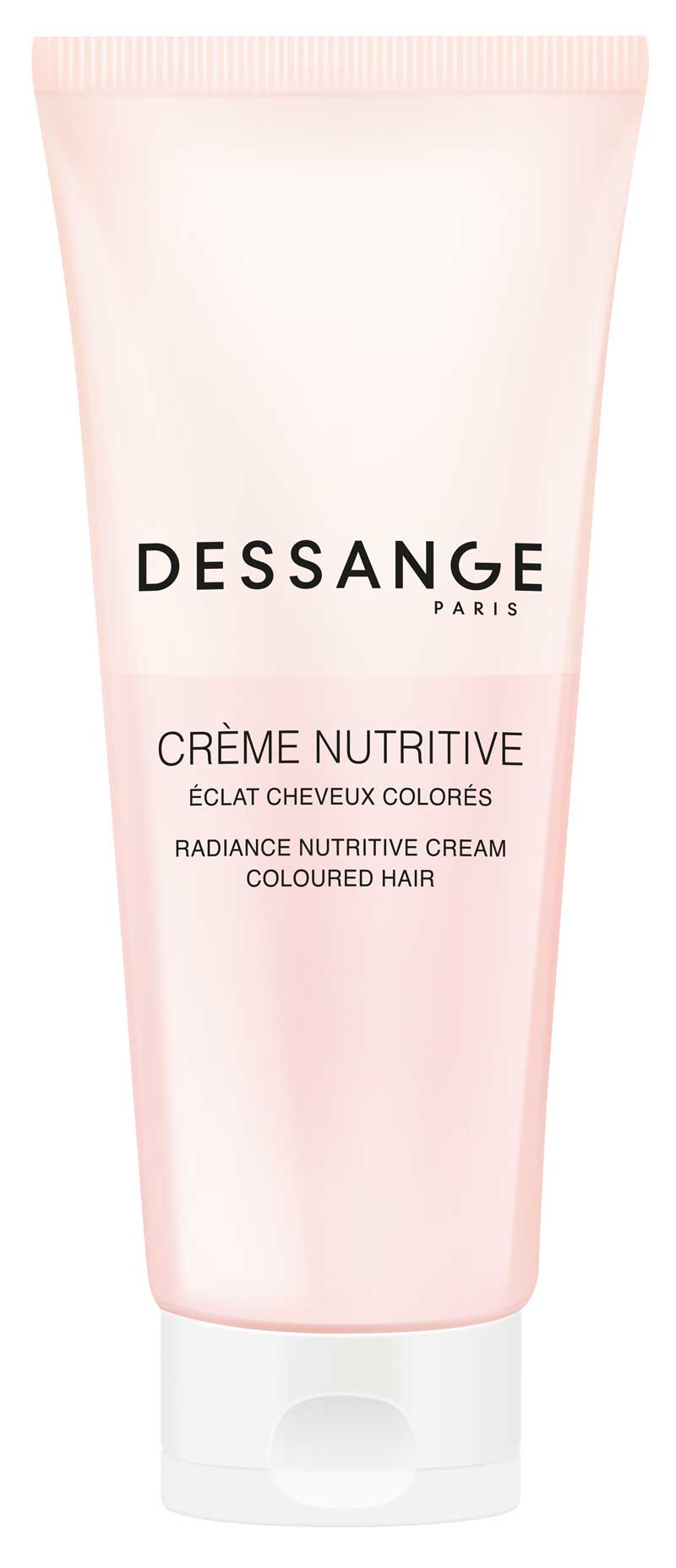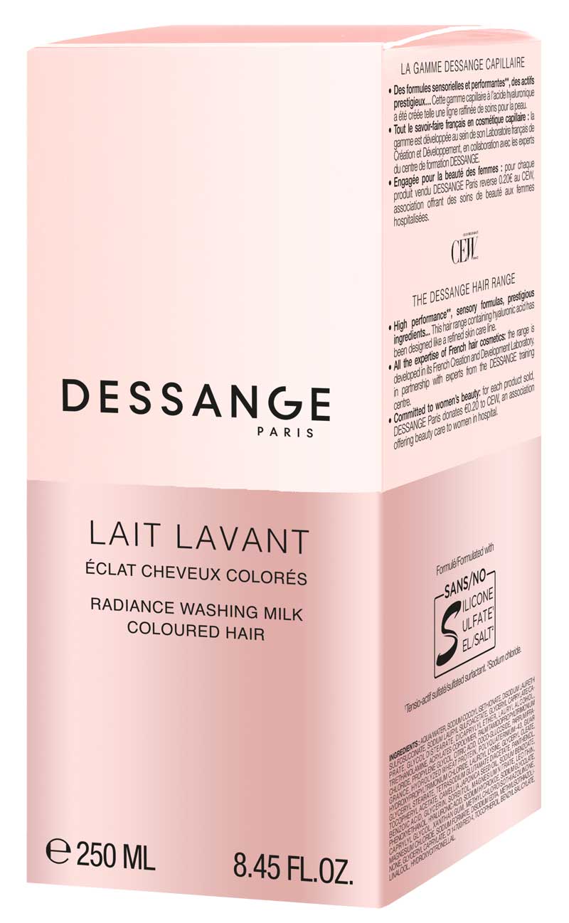 » Línea radiante: desarrollo del tratamiento del color. Para realzar el brillo, los reflejos y los matices del cabello con color, Dessange ha desarrollado dos productos: una leche limpiadora (Lait Lavant) y una crema nutritiva (Crème Nutritive), ambas con un suave aroma afrutado de bergamota y frambuesa, así como rosa, vainilla y pachulí. Además, combina tres ingredientes activos: ácido hialurónico hidratante, un antioxidante derivado de la vitamina E (los dos actúan como perfeccionadores del color) y aceite de camelia. Con ellos, el brillo y la intensidad del color se conservan.