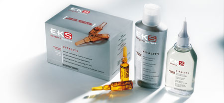 Para fortalecer el cabello, favorecer la microcirculación sanguínea y controlar la caída del cabello, la firma Intercosmo ofrece la línea de productos EKS Surgivamarine Vitality. Este tratamiento tiene como componente base el exclusivo e innovador complejo Aquamaris Complex, compuesto por agua de manantial marino, algas y Sea Oligon Complex. En el Menú Vitality, Aquamaris Complex ha sido enriquecido con el alga Rhodophicea Hidrolizada y con principios activos que, actuando en sinergia, desarrollan una acción remineralizante, astringente y cicatrizante, mejorando la microcirculación sanguínea.