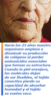 Aproximadamente hacia los 25 años nuestro organismo empieza a disminuir su producción de colágeno al perder aminoácidos esenciales que forman su estructura. Esto, junto al continuo desgaste de nuestro cuerpo por el ejercicio y el quehacer diario, determina nuestro proceso hacia la vejez. Cuando la piel envejece, las moléculas dejan de ser flexibles, el tejido conectivo pierde su capacidad de absorber humedad y el tejido se vuelve seco.