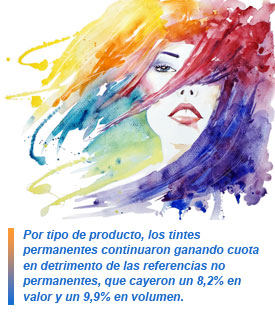 Este pequeño avance es consecuencia de la política de contención e incluso rebaja de precios que ha protagonizado el sector en los últimos años, ya que el volumen comercializado en el periodo señalado se incrementó un 6,5%. Por tipo de producto, los tintes permanentes continuaron ganando cuota en detrimento de las referencias no permanentes, que cayeron un 8,2% en valor y un 9,9% en volumen. Los tintes tono sobre tono, por su parte, también retrocedieron, hasta ingresar un 4% menos, por la venta de 3,63 millones de unidades (-0,9%).