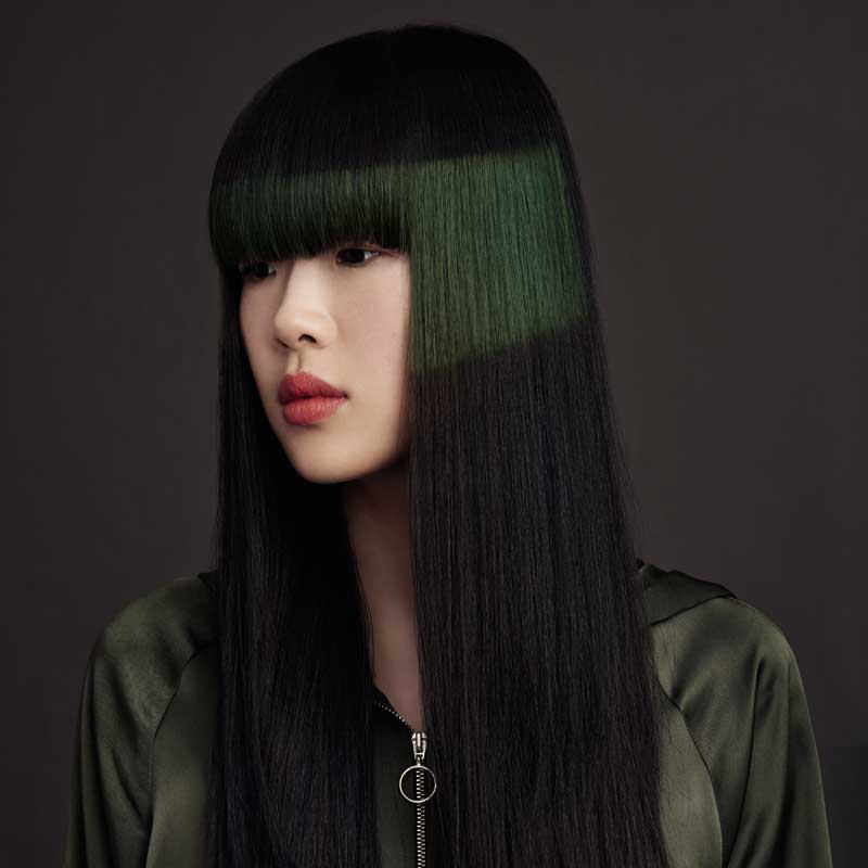El poderoso contraste se destaca aún más por el corte equilibrado y simétrico que crea la tridimensionalidad. Un rostro rectangular es suavizado por líneas fuertes mientras que el flequillo enmarca los ojos y crea una mirada magnética y penetrante.