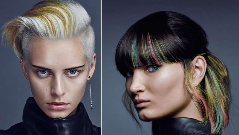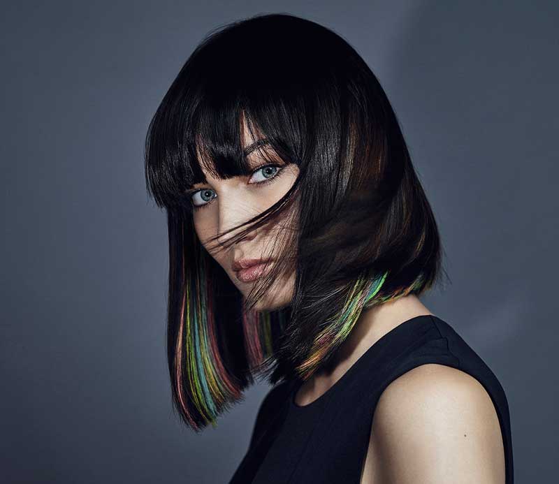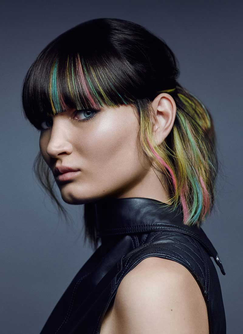 Este look, que combina un flequillo rotundo con turquesa, rosa y amarillo, es rico en contrastes y muy expresivo. Los tonos dan un efecto neón al cabello negro, creando un look que integra fuerza y diversión. La colocación de los efectos de color aporta a cada estilo un look diferente y sorprendente. A veces se muestra salvaje, otras sensual, y en ocasiones elegante y femenino. Pero eso sí, siempre creativo.