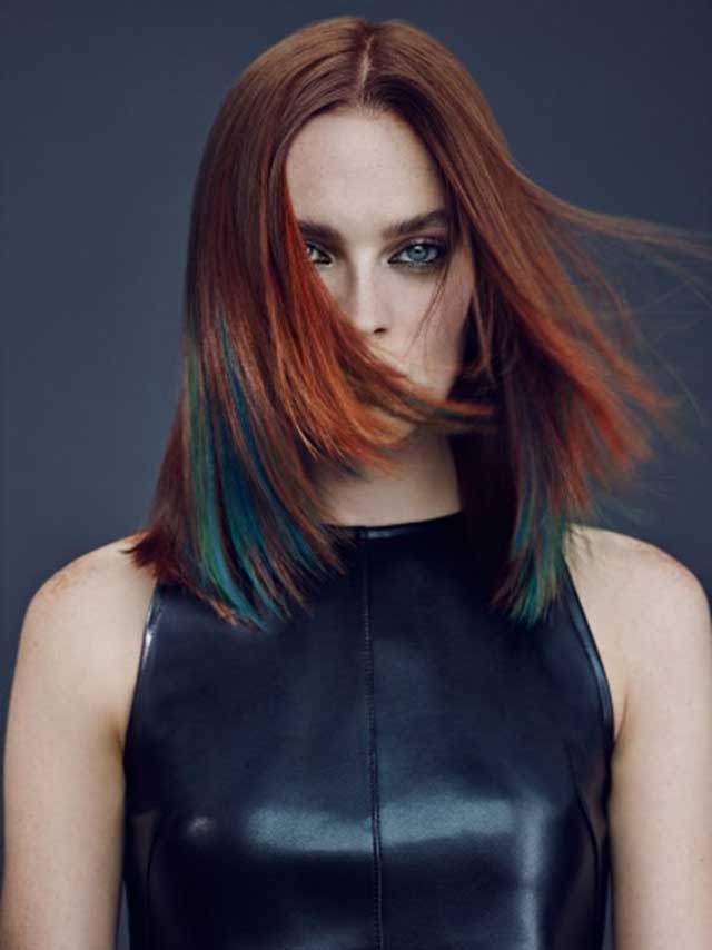 Elegante, femenino y extraordinario: el cabello por debajo de los hombros da un aspecto con mucha clase, especialmente en ricos tonos castaños. Un look clásico y femenino que incluye contrastes de color impactantes y aporta un plus de frescura gracias a los tonos turquesa Elumen a través del cobre.