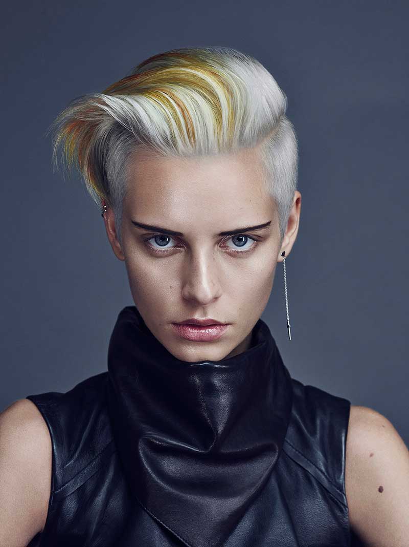 Moderno y rockero: el rubio se convierte en un look rotundo gracias a Elumen. Tonos rubios con matices amarillos, cobrizos y fríos que forman mechas sobre un flequillo extralargo. Un estilo versátil gracias al corte y a una capa superior extralarga. El color aparece nuevo y diverso.
