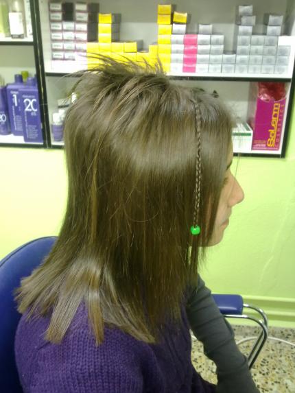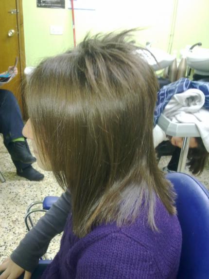 a esta chica le pegaron un chicle en la cabeza, en lugar de decirlo a su madre se pego un tijeretazo, la mama desesperada acudio a mi, por favor arregla ese desaguisado, este es el resultado, quiza no sea un corte a la ultima moda pero fue lo mejor que se me ocurrio para disimular semejante averia