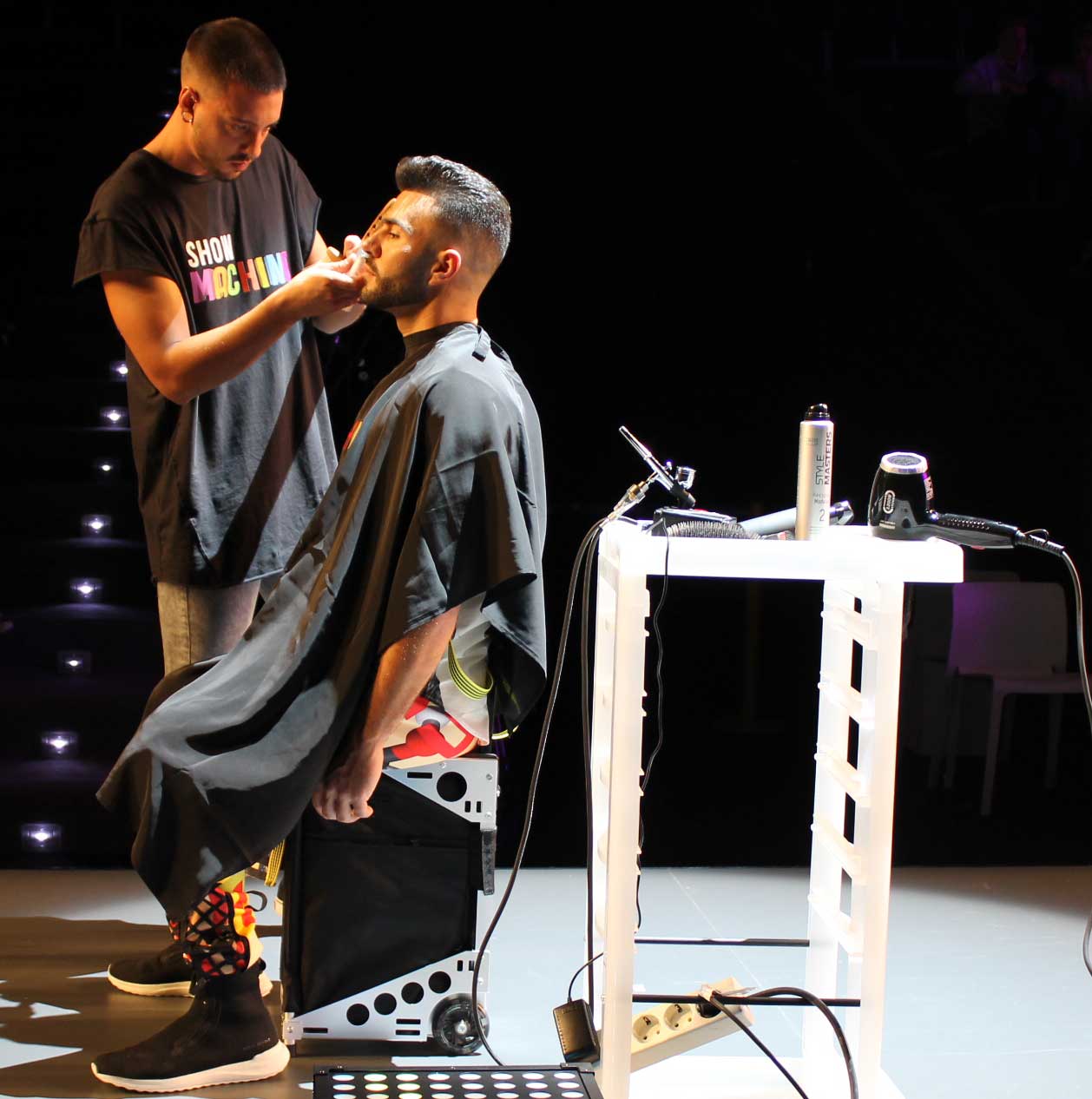 En barbería, se ha dado el toque final a fades muy degradados, acompañados de barbas muy marcadas, rellenadas con aerógrafo. Se trata de una tendencia latina que está muy de moda, según Rodelas. Además del aerógrafo, se emplean plantillas que rellenan zonas con poco pelo e incluso tapan posibles canas. El producto se elimina con agua. "El aerógrafo es una buena opción para no comprometer la línea original del cliente. Sirve para barbas pero también para trazar laterales de cabello en zonas poco pobladas", ha explicado.