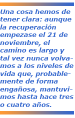 Se acercan unas elecciones generales que a todos se nos antojan de una importancia crucial. De alguna manera, creo que con más optimismo que realismo queremos creer que el día después la crítica situación económica cambiará y las cosas empezarán a ir mejor. Es posible que el mero hecho de un cambio de caras en el Gobierno provoque que veamos las cosas distintas, eso que solemos llamar “una bocanada de aire fresco”. Pero una cosa hemos de tener clara: aunque la recuperación empezase el 21 de noviembre, el camino es largo y tal vez nunca volvamos a los niveles de vida que, probablemente de forma engañosa, mantuvimos hasta hace tres o cuatro años.