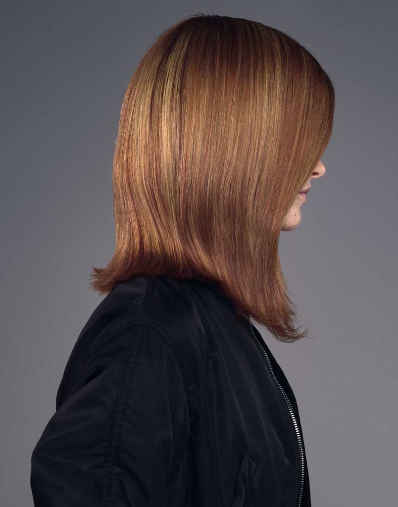 Corte por el hombro con un acabado elegante, con maquillaje minimalista para una sensación de frescura. El color utiliza los tonos de oro y cobre Igora Royal para crear un look multitonal.