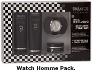 1) Watch Homme, compuesto por un exclusivo reloj de VMV y por tres de los productos más vendidos de la línea hombre de Salerm Cosmetics Homme: el gel de afeitado transparente Parfait Système Rasage, el champú-gel Stop Stress y Contrôle Creme Mat, una cera de acabado.