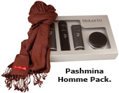 2) Pashmina Homme Pack está compuesto por una exclusiva pashmina diseñada para Salerm Cosmetics por Edda Rezzonico y por cuatro productos de la línea masculina: Parfait Système Rasage; champú-gel Stop Stress; la crema facial Fatigue Contrôle 24, antifatiga express, y el Fusion Gel, innovador gel de peinado.