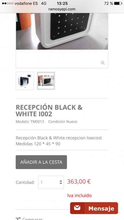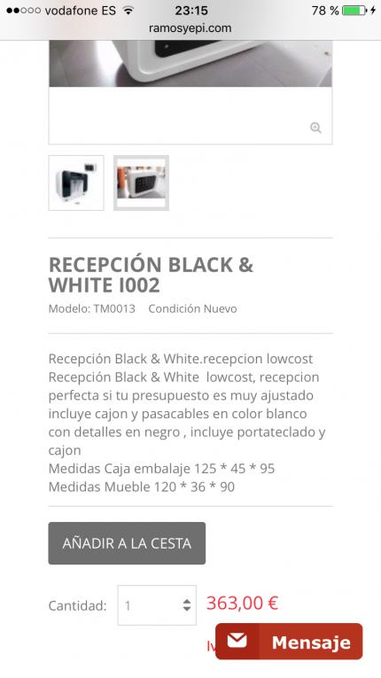 A ver que opinais.. Ayer me llega una recepción que compré en www.ramosyepi.com. Bueno, la recepción me cuesta 363 euros, me llegó mal pintada, con puntillas por fuera... Fatal. Me quejo y la respuesta es que: - como es una recepción low cost que no puedo esperar una recepción de gama alta. (Eso lo puedo llegar a entender) Lo otro, cuando voy a comprarla miro que las medidas me encajen y pone que mide 45 cm de ancho con lo cual me va perfecta para la caja registradora, y resulta que me llega y mide 36 de ancho con lo cual la caja registradora con un roce se me va a caer.. Le he pedido que me devuelva el dinero porque la descripción de las medidas no es la correcta y no, me dice que me mire otra (carisimas) y envie la mia y pague la diferencia. Que os parece que debereria hacer la tienda en esta situación?