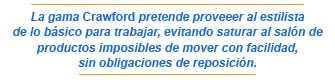 La gama Crawford pretende proveeer al estilista de lo básico para trabajar, evitando saturar al salón de productos imposibles de mover con facilidad, sin obligaciones de reposición. Rapidez, practicidad, y rentabilidad son las máximas de Crawford.