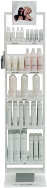 Crawford Professional propone un expositor de productos adaptado a las necesidades del salón: práctico, cómodo, con toda la gama de cosmética capilar necesaria de alta calidad en sus formulaciones, y sobre todo, a un precio muy competitivo.