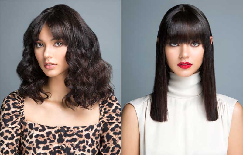 Liso oriental. Largo hasta las pestañas, este flequillo cambia la línea recta horizontal por un suave despuntado. El peinado acabado en liso potencia su geometría con un tono negro resaltado con mechas chocolate brown.