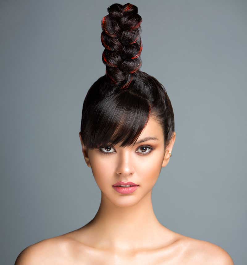 A un lado. Más coqueto y elegante, el flequillo a un lado, sube puntos a este recogido coronado por una gran trenza que brilla en rojo gracias a una mecha encendida.