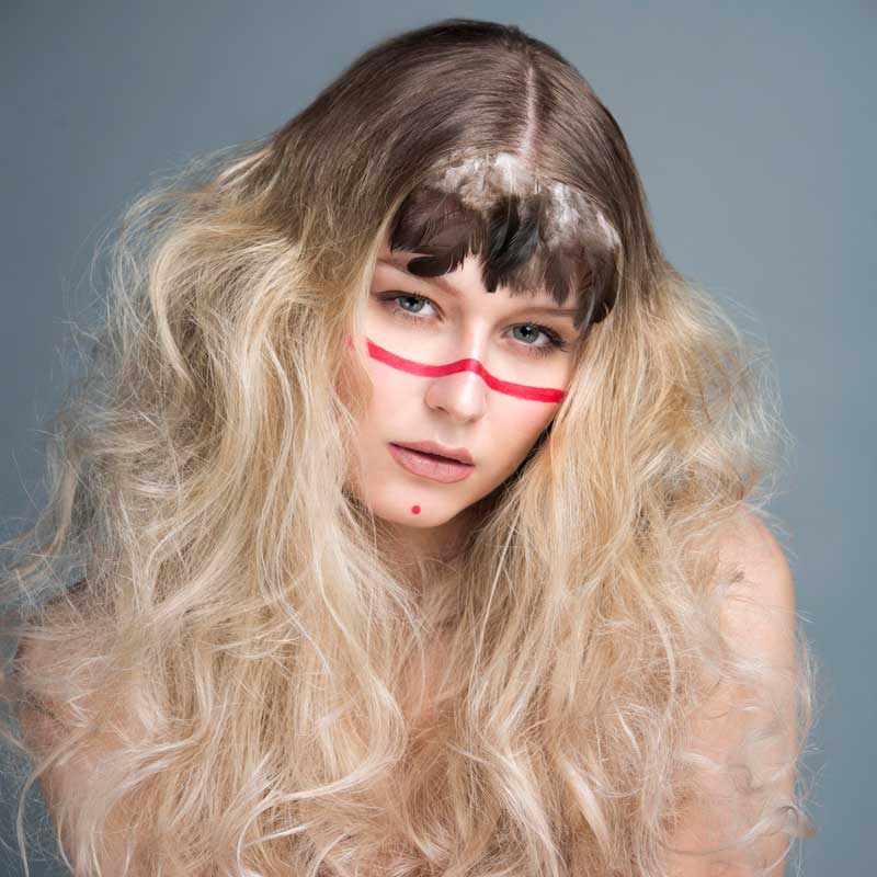 A lo grande. Gran flequillo con gesto ladeado que se funde con las mechas de la melena y se integra hasta la coronilla sobre un recogido hecho a base de retorcidos. La magia de este flequillo está en el juego de colores neón de clara inspiración graffiti y pintado con esprays de colores.