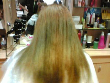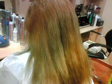 AKI OS PONGOS UNAS FOTOS QUE NO SE SI LO APRECIAREIS BIEN SON CON EL MOVIL PERO BUENO, ES UNCAMBIO QUE LE HICE UN RESET Y DESPUES LE APLIQUE UN 7.05 CON UNAS MECHAS CON DECO A 0 VOL. PERO LO PEOR FUE QUE CUANDO ACLARE EL REST EL PELO ESTABA VERDE AZULADO, AHI VAN
