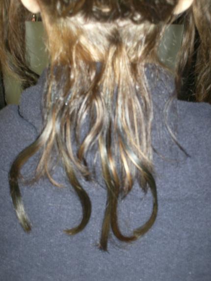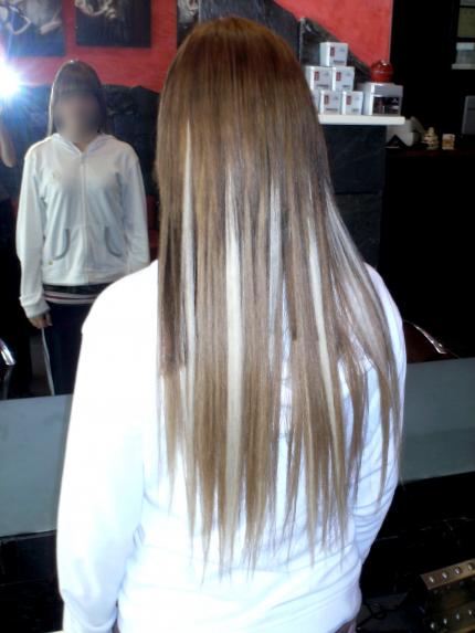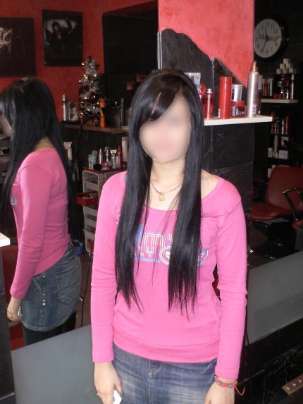 bueno...esta chica ya llevaba extensiones...(de hace casi 6 meses)se le han caido muchas...pero le estan aguantando bien y se las sabe manejar incluso con 5 dedos de raiz(son de queratina....se las corto pero no ha querido quitarselas para darse mas cuerpo en la melena...hasta que se le vayan cayendo....ahora lleva las nuevas de hoy...(largas) las de hace 6 meses (poco mas abajo de los ombros) y el suyo...(algo mas corto).a ver si os gusta.