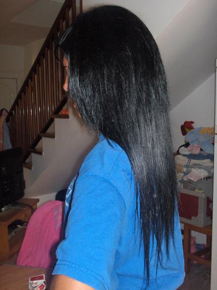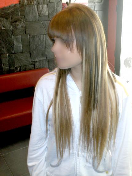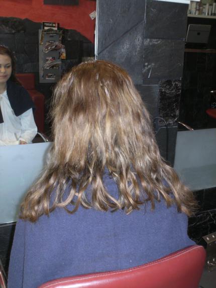 tengo que añadir....que el color si fue muy complicado de buscar....llevaba un negro la ultima vez que la atendí....ese color que ves ahora en ella.....no es siquiera un tinte....es una decoloracion,totalmente casera,hecha por su madre con productos del super.como podras imajinar,es muy dificil de encontrar una extension igual,....yo diria que esta bastante logrado...el color sobretodo....mira,de esto hace apenas 6 meses.