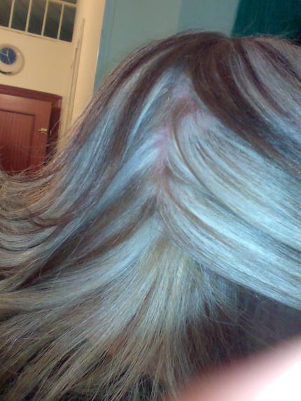 pero bueno en este caso el merito es de la clienta solo lo he matizado su base con un rubio violeta.y le hecho las mechas bitono claro
