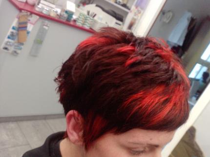 Karma, he aplicado un chocolate de base, he decolorado los mechones con 30vols, he lavado y he aplicado un naranja fantasía a todo el pelo, el resultado, súper fashion...