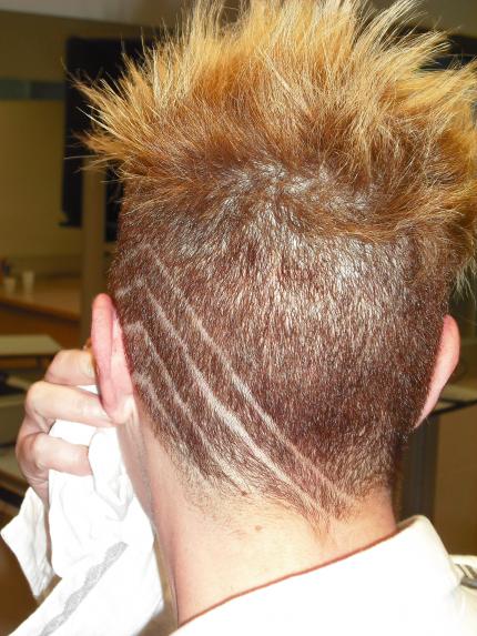 El lateral rapado bien, pero en nuca y coronilla con el pelo corto a medias sin pulir y el peinado no me gusta.No dudo de los profesionales del curso pero creo que ese corte esta amedias por lo menos para mi gusto.Esas rayas ya no se ven por el mundo...