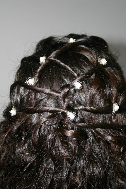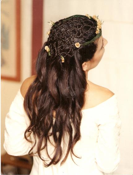 tabare los retorcidos son un postizo que hice con cabello del misno color imitando una red medieval. Si te fijas en la parte delantera todo el tocado es de hojas y flor natiral haciendo una corona sobre la frente era precioso.Se lo quedo de recurdo( pagando claro)