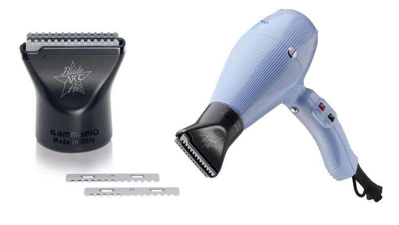 Blade Art Air es una boquilla navaja para crear cortes esculpidos y looks originales. El producto se puede utilizar con el nuevo secador Aria, de Gamma Piu. Se trata del primer secador del mundo que corta y seca el cabello a la vez. Se presenta en un cartón de 12 unidades. Entre sus principales características técnicas destacan: