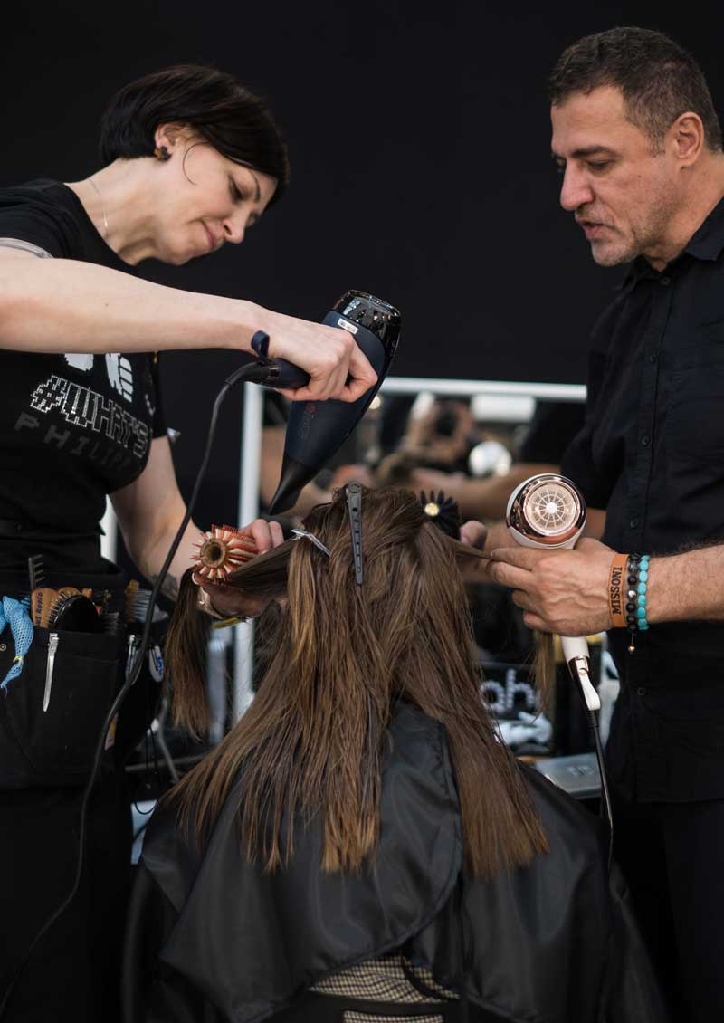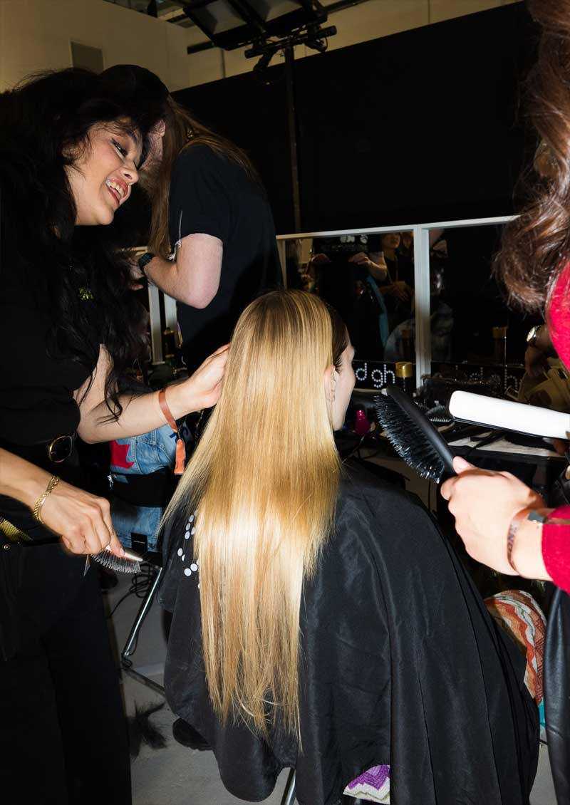 En el backstage del desfile de Missoni, el equipo de peluqueros de ghd, liderado por Anthony Turner, crea los peinados de una colección inspirada en la geometría y los grafismos, una característica distintiva de "La Maison".