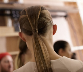También en Londres, Mario Schwab contó con Sam McKnight para la puesta en escena de su colección. "ghd eclipse® ha sido la clave para reflejar el aspecto elegante y suave de la colección de Mario Schwab" dijo Sam McKnight en París. El estilista quiso reflejar en el cabello de las modelos, los contornos lineales de la colección, creando un aspecto suave y femenino, con rostro despejado y peinado hacia atrás, haciendo un guiño al Hollywood de Greta Garbo o Stella Tennant.