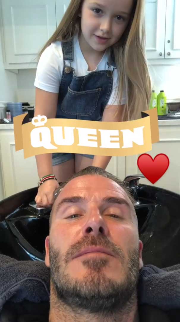 En las imágenes, se puede ver a la pequeña Harper lavando y masajeando el pelo de su padre. El vídeo se acompaña del texto Queen (reina), haciendo referencia a la joven peluquera, muy interesada ya en el mundo de la imagen. Parece ser que Harper Seven se fija también en la moda y las nuevas tendencias y no duda en sugerir y hacer comentarios a su madre, la exspice girl reconvertida en diseñadora.