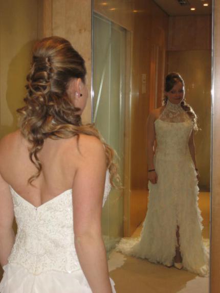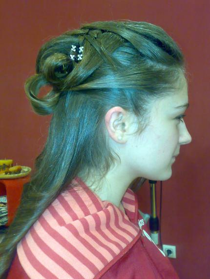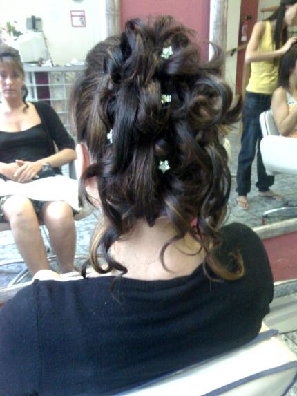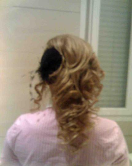 pues es sencillo,separe los laterales para posteriormente cruzarlos por mechones no me gustan los laterales lisos y repeinados,en la parte de atras ize una coleta en la parte de arriba y tres en la parte central,el resto es ir aciendo anillas dejando las puntas fuera para luego rizarlas con tenacilla,esta chica tenia pelo largo y bastante,mañana os pondre una chica ala que se le ve el lateral para que veas como los hago,pues ahora no tengo la foto,por delante llevaba flequillo,pero puedes jugar a dejarlo liso,poner tupe,a tu libre elecion.un besazo
